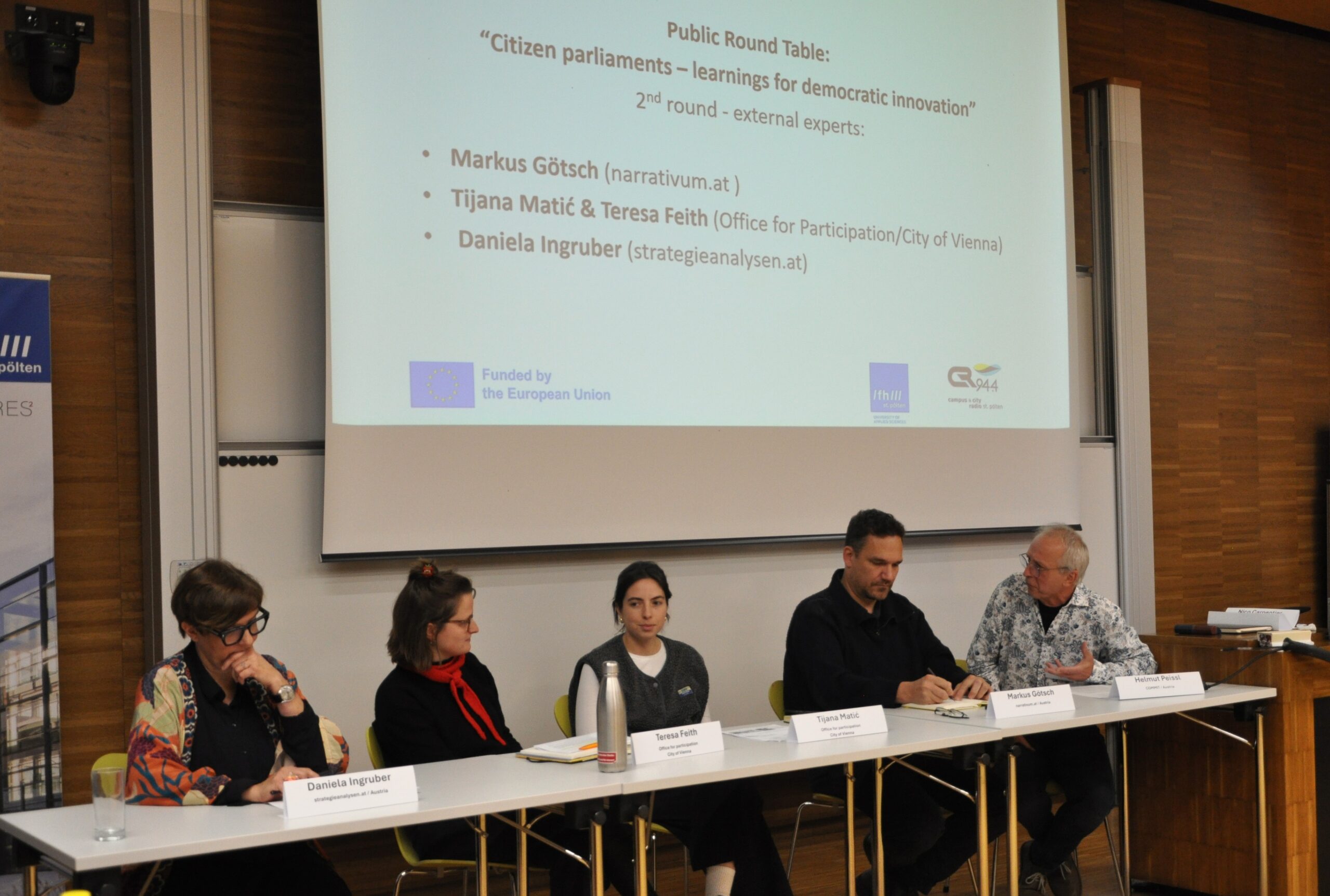 COMMIT had invited to a public roundtable on “Citizen parliaments – learnings for democratic innovation” on 24 September, which was also streamed online. During the first part of the roundtable, the project partners COMMIT (Austria), Charles University (Czech Republic), Mary Immaculate College (Ireland), and the Peace Institute (Slovenia) presented and discussed the findings of the Citizens‘ Parliaments on Media and Democracy, which were organised between March and May 2025 in the four countries.